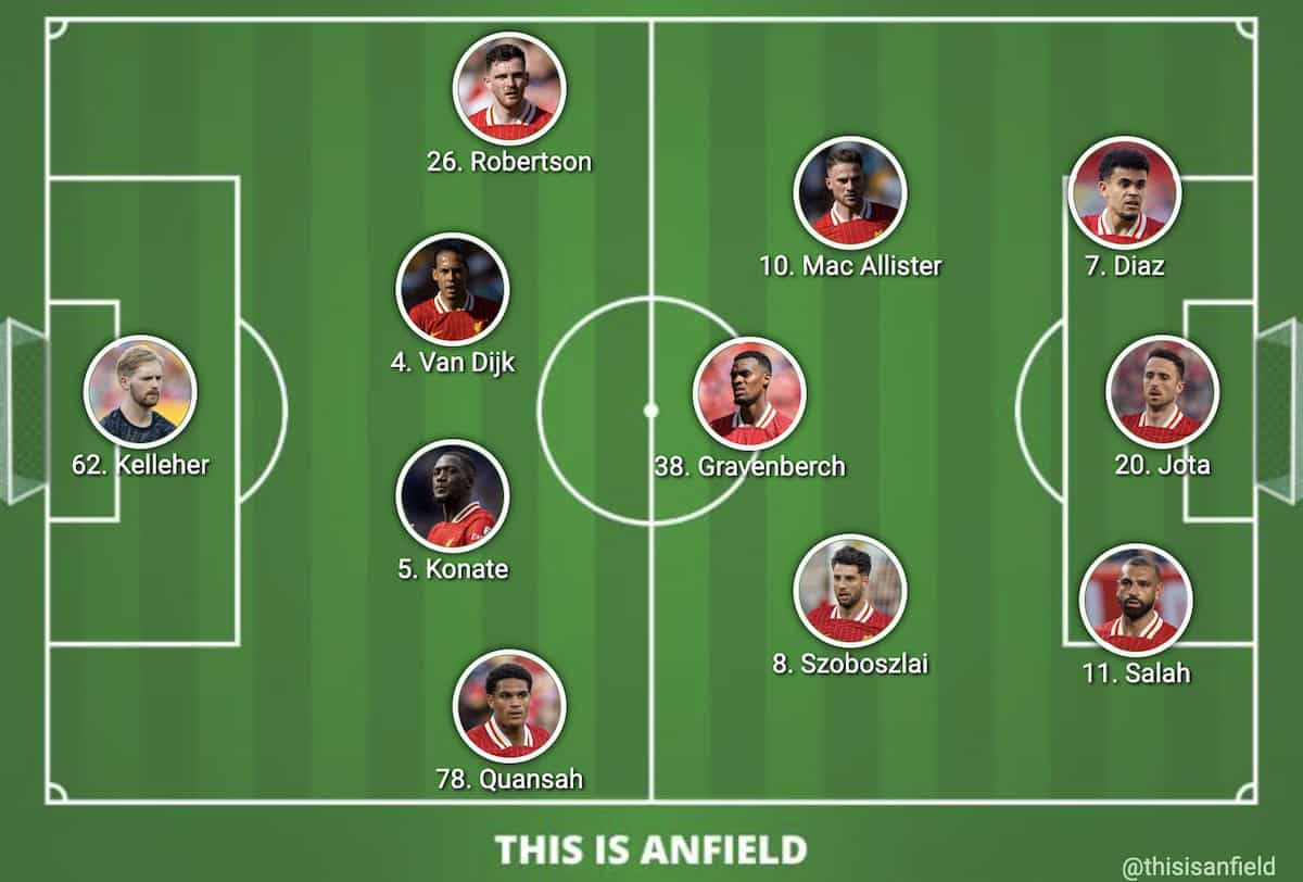 В полузащите сыграет привычное трио: Райан Гравенберх, Доминик Собослаи и Алексис Мак Аллистер. Атака «Ливерпуля» на этот вечер: Мохамед Салах, Луис Диас и Диогу Жота. Это означает, что Дарвин Нуньес, Коди Гакпо и Кертис Джонс начнут матч на скамейке запасных. Состав «Ливерпуля»Основной состав: Келлехер; Куанса, Конате, ван Дейк, Робертсон; Гравенберх, Собослаи, Мак Аллистер; Салах, Диас, Жота. Запасные: Алиссон, Цимикас, Эндо, Джонс, Макконнелл, Эллиотт, Кьеза, Нуньес, Гакпо. Состав «Ньюкасла»Основной состав: Поуп; Триппьер, Шар, Бёрн, Ливраменто; Тонали, Жоэлинтон, Гимараэш; Мёрфи, Барнс, Исак. Запасные: Дубравка, Крафт, Таргетт, Лонгстафф, Уиллок, Майли, Нив, Осула, Уилсон.